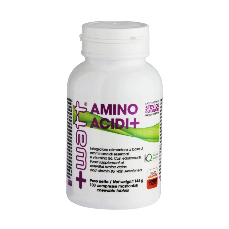 +WATT Aminoacidi+ KYOWA QUALITY® è un integratore alimentare di aminoacidi essenziali di origine vegetale (EAA, essential amino acids o AAE) garantito senza glutine e disponibile in comode capsule masticabili al gusto di arancia.