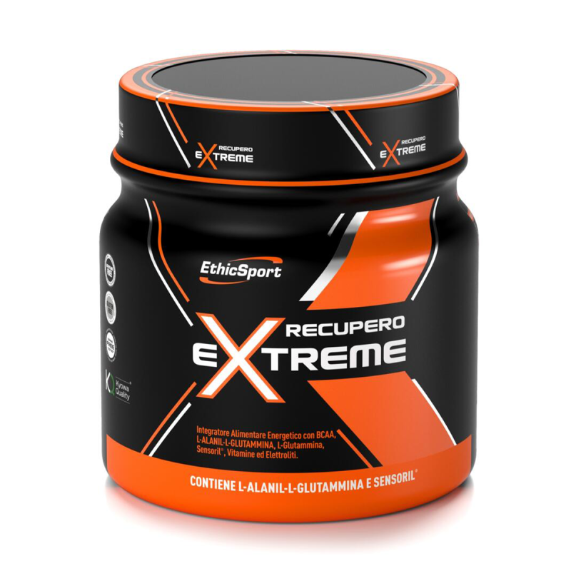 Inoltre Recupero Extreme contribuisce alla riduzione della stanchezza e dell’affaticamento, alla normale funzione muscolare e al normale metabolismo energetico, apporta un elevato dosaggio di BCAA e il dipeptide L-Alanil-L-Glutammina (AlaGln). Il prodotto contiene anche il brevetto Sensoril®, estratto da Withania S., che risulta essere un tonico adattogeno, utile per contrastare la stanchezza fisica e mentale, e facilitare il rilassamento psico-fisico.