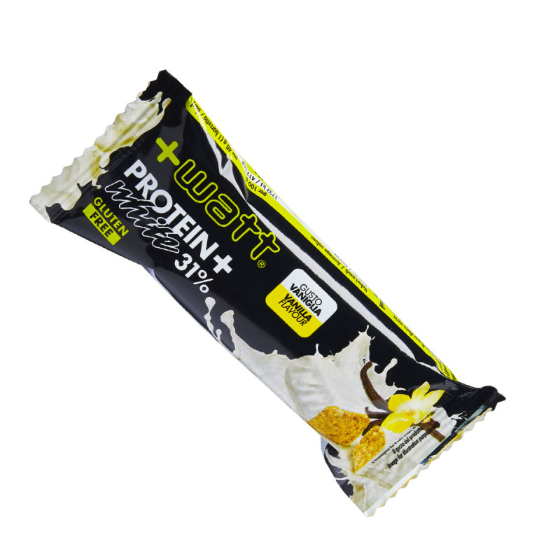 È la +WATT Protein White BAR! Una barretta ad alto contuto di proteine con una squisita copertura fatta di glassa di latte e un morbido ripieno altamente proteico (31%).