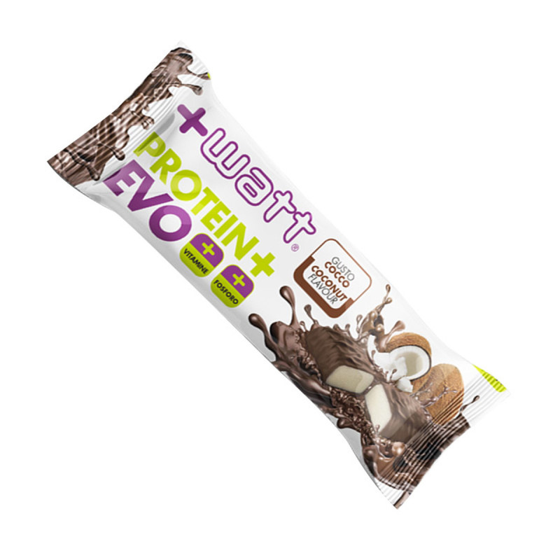 Morbida all'interno, +WATT Protein+ EVO è disponibile nei golosi gusti Crème Caramel e Cocco e presenta un'irresistibile copertura croccante di Cioccolato al Latte.