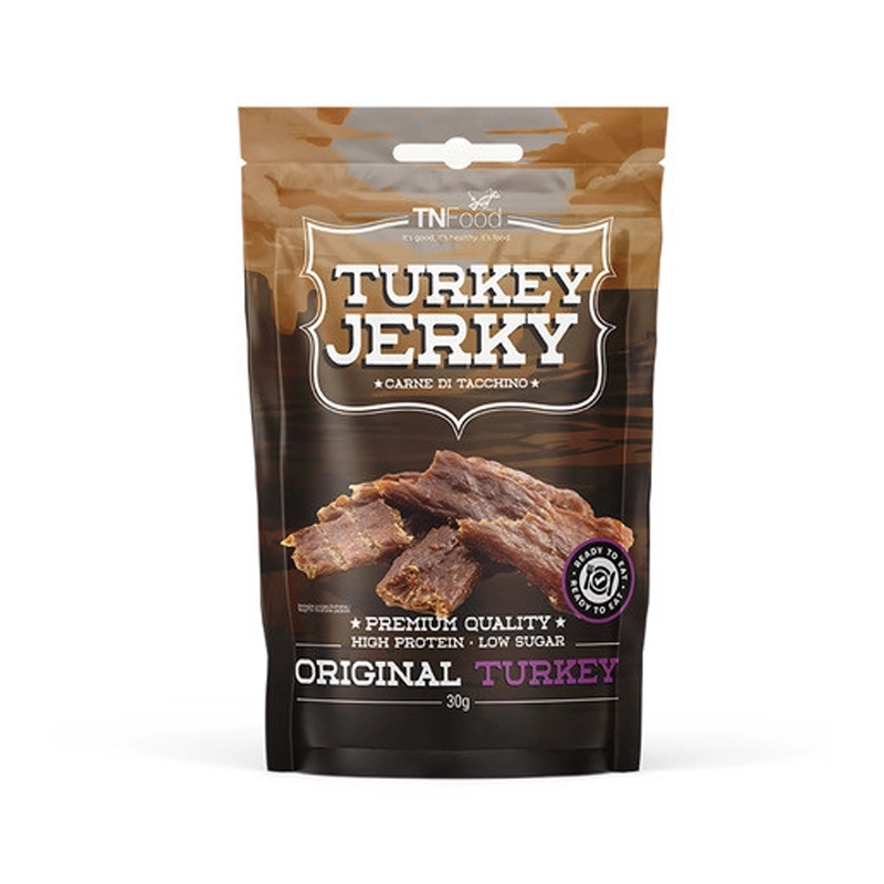 TURKEY JERKY TN FOOD - CARNE DI TACCHINO ORIGINAL TURKEY - SNACK PROTEICO PRONTO DA MANGIARE - ALTO APPORTO PROTEICO E BASSISSIMO CONTENUTO DI ZUCCHERI E CARBOIDRATI.