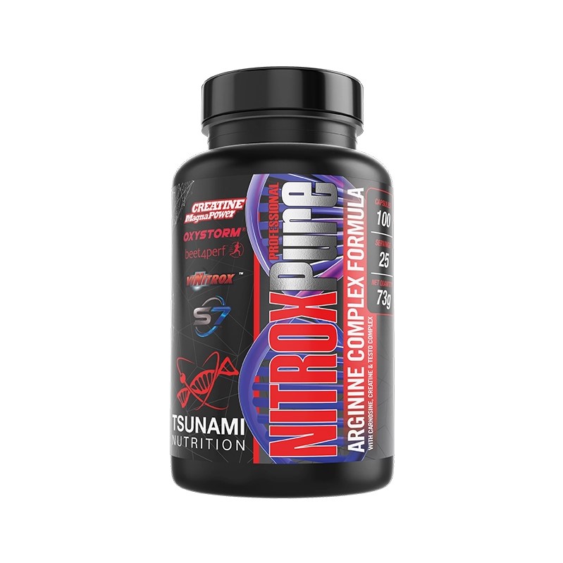 Nitrox Pure Professional di Tsunami Nutrition è un integratore ideato per stimolare la produzione naturale di ossido nitrico (NO), utile per migliorare la vasodilatazione, la prestazione sportiva e il recupero muscolare. Non contiene direttamente NO, ma ingredienti brevettati come ViNitrox™, S7™, Beet4Perf™ e Oxystorm®, che aumentano i livelli di NO in modo naturale.