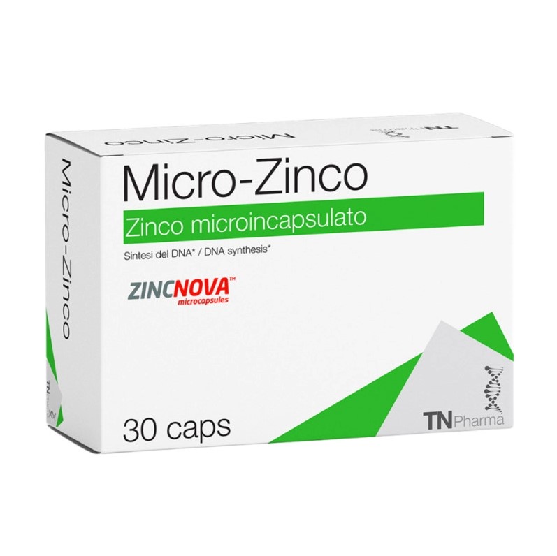 Micro‑Zinco di TN Pharma è un integratore a base di zinco microincapsulato con brevetto ZincNova™, in una capsula vegana senza glutine e lattosio.