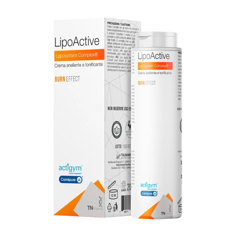 La formula di LipoActive sfrutta le proprietà di ingredienti come la caffeina e il ginseng e di brevetti di altissima qualità come Actigym™ Marine Ingredient, una sostanza elaborata grazie alle più moderne applicazioni della biotecnologie all'ecosistema marino che agisce efficacemente in termini di tonificazione muscolare e definizione della silhouette, e LYPOSYSTEM COMPLEX® con Carnipure®, complesso formato da carnitina e fosfolipidi in grado di svolgere un'azione rassodante e tonificante da una parte, dall'altra svolgendo un'azione emolliente e nutriente che mantiene la cute elastica e in ottime condizioni.