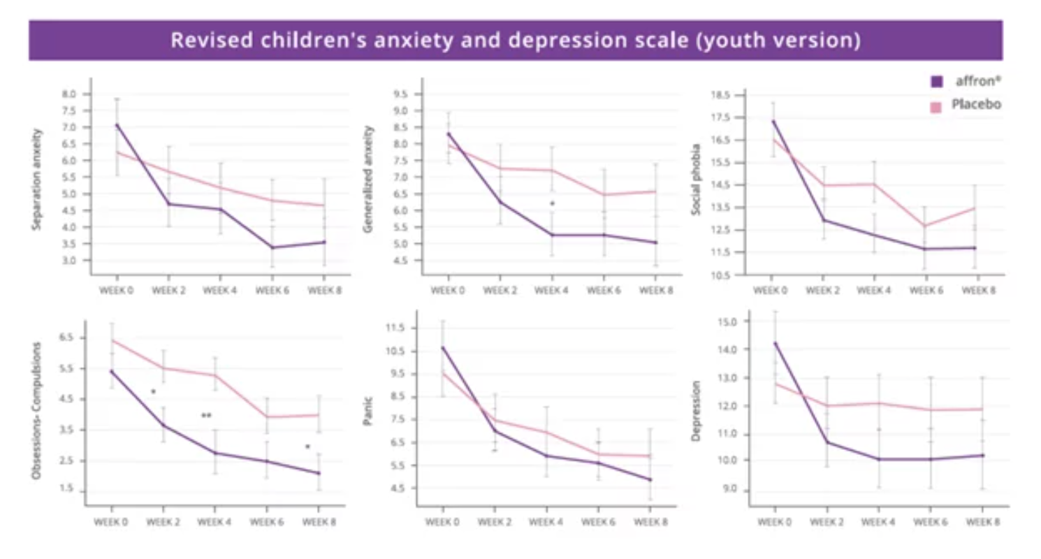Uno studio randomizzato, in doppio cieco, controllato con placebo (N=68) per vedere l’effetto di 28 mg/die di affron® sui sintomi ansiosi e depressivi negli adolescenti (12-16 anni) con sintomi da lievi a moderati nell’arco di 8 settimane.