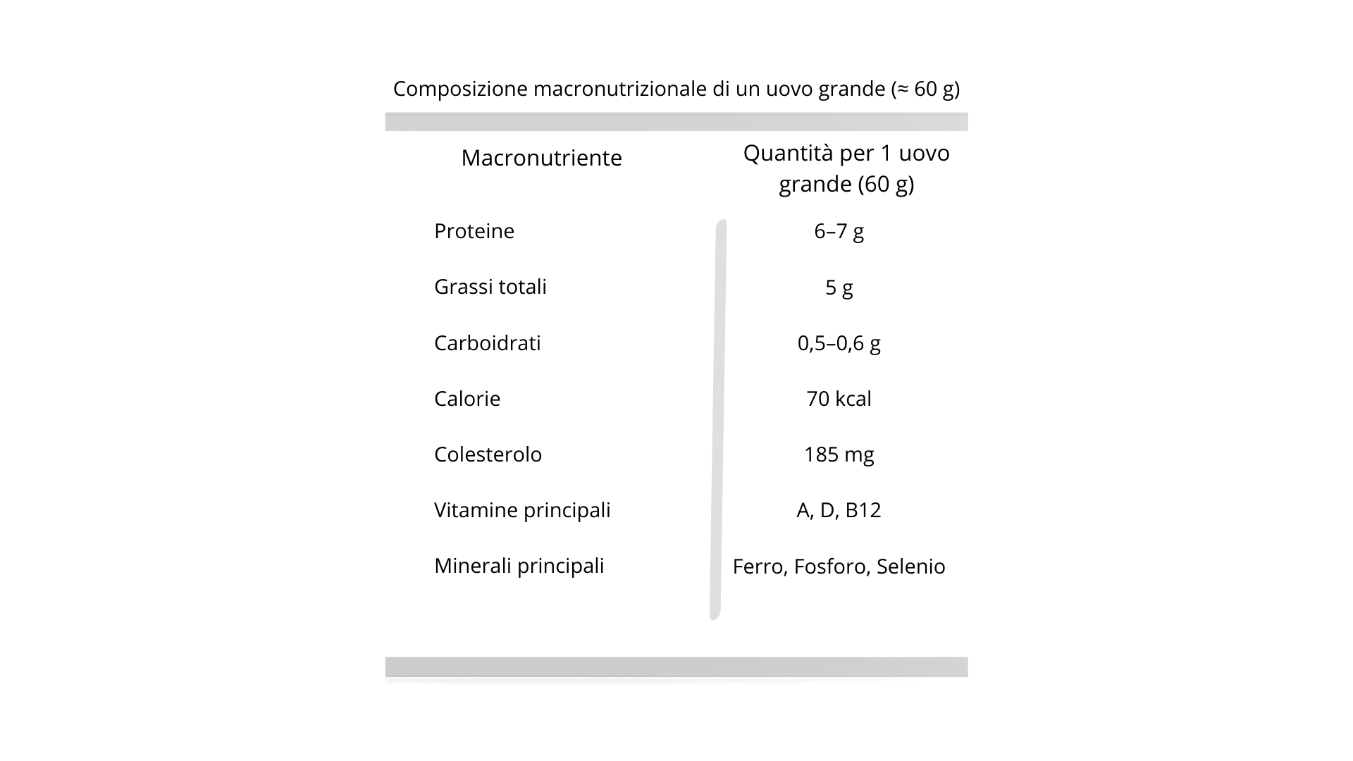 Ci sono differenti tabelle di composizione per l'uovo. Noi ti mostriamo le quantità dei nutrienti per un uovo grande (circa 60 g):