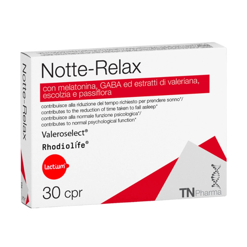 Per alleviare le problematiche che comporta l'insonnia il team di TN Pharma ha realizzato Notte-Relax, un integratore Senza Glutine in compresse a base di melatonina, GABA, Valerina, Escolzia, Passiflora ed ingredienti brevettati che alleviano i disturbi del sonno e migliorano la fase di addormentamento e la qualità del riposo notturno. Vediamo nel dettaglio la sua formula: