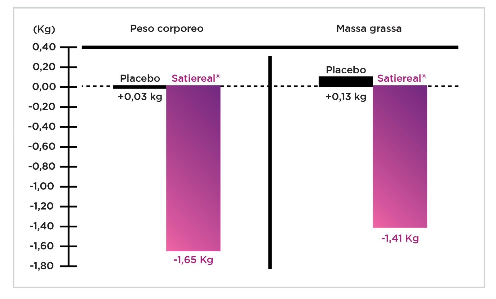 L'ovvia conseguenza di queste proprietà di Satiereal® è un effetto diretto sulla diminuzione del peso corporeo (sempre certificata dagli Studi Clinici di riferimento), con focus sulla massa grassa! (Grafico 1)