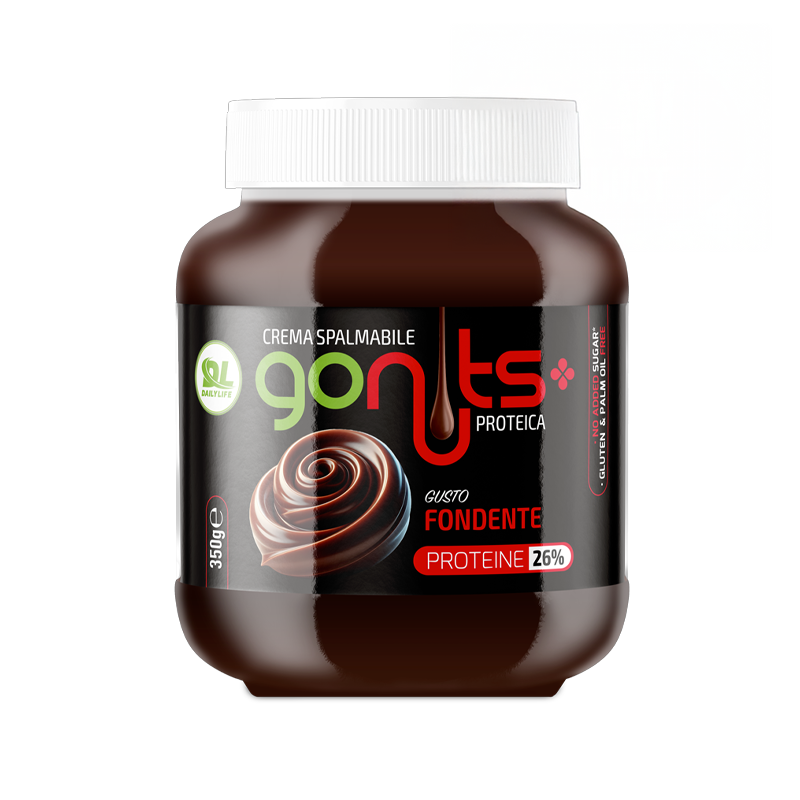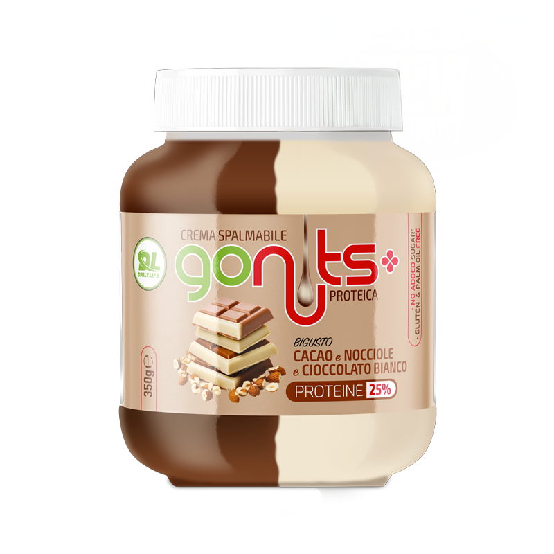 Daily Life GoNuts! è la crema spalmabile, disponibile in diversi gusti, con un contenuto di i proteine del siero del latte maggiore del 20% (a seconda del gusto), senza olio di palma e zuccheri aggiunti formulata per dare una nota di gusto in più ai tuoi spuntini ma senza alterare la tua forma fisica.