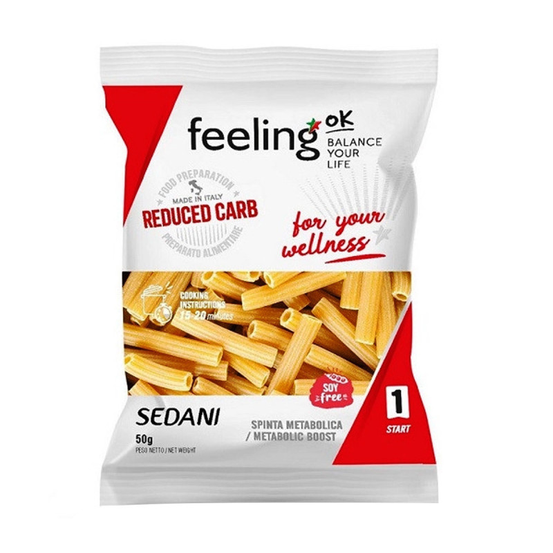 FeelingOk +Protein Sedani è un prodotto della prima linea di prodotti di FeelingOk: +Protein. Si tratta di una linea di alimenti a ridotto tenore di carboidrati idonea a far ripartire un metabolismo abituato ad un'alimentazione ricca di zuccheri e amidi.